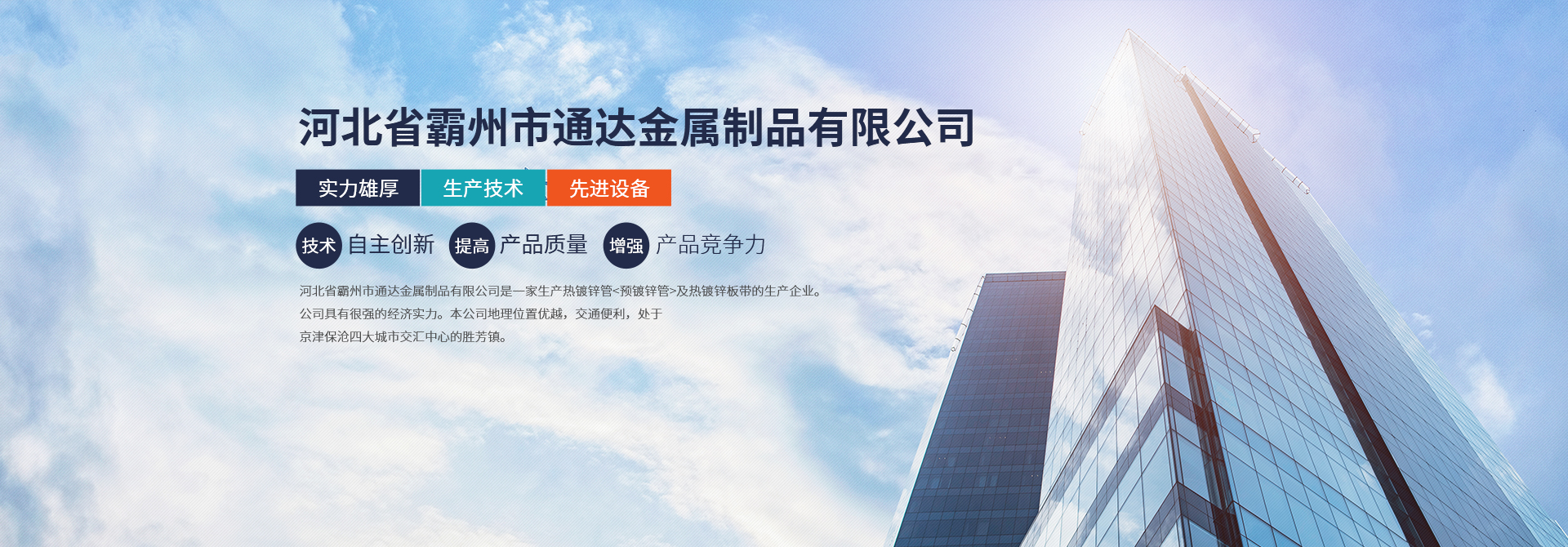 河北省霸州市通達(dá)金屬制品有限公司是一家生產(chǎn)熱鍍鋅管<預(yù)鍍鋅管>及熱鍍鋅板帶的生產(chǎn)企業(yè)。公司具有很強(qiáng)的經(jīng)濟(jì)實(shí)力。本公司地理位置優(yōu)越,交通便利,處于京津保滄四大城市交匯中心的勝芳鎮(zhèn)。由于公司不斷發(fā)展壯大,良好的投資環(huán)境為我公司的發(fā)展提供了可靠的保障。本公司是河北省重合同守信用企業(yè),被評(píng)為AAA級(jí)信用企業(yè)。
